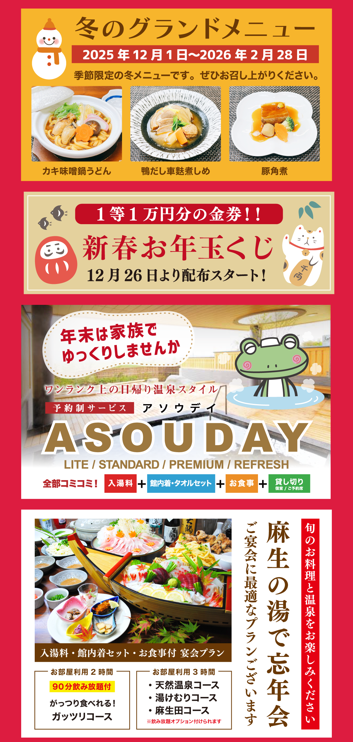 ASOUDA CAFEは地元の食材にこだわった温泉グルメ食堂です。ファミリーの皆様、ご友人同士などお気軽に食事を楽しめる空間になっています。ご宴会、パーティーにご利用もいただいております。